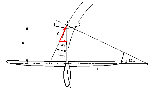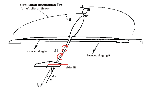 A special problem for open class sailplanes with large wing span results from different flow velocities along the span during circular flight. Therefore there are consequences for the wings geometry and the design of the wing’s control mechanism. eta has got three sets of wing flaps. They facilitate efficient of the flap-setting for landing, with the inner flap set to about 55°, the middle flap on the maximum normal setting for circling, and the outer flap set to a significant upper position. Due to the large wing span a large, effective fin is needed for good handling. Differential Aileron ThrowThe design of the control mechanism of the ailerons was done for good handling in steep circular flight. A high differential throw is a good way to reduce the negative yaw. In addition the design was optimized to obtain a very small rise of induced drag from deflection of the ailerons. FlaperonsFlaperons are the wing’s flaps with mixed deflection for flap settings and aileron throw. eta has got all three flaps used as flaperons. The inner flaperon has just a lilttle throw by aileron which has got a sufficient skip in circulation distribution leading to a vortex going downstream to the fin (s. drawing). This vortex leads to a side wind on the fin with a lift as result. This leads to a yawing moment in opposition to the negative yawing-effect caused by aileron deflection, making possible a flight without sideslip. This effect could be increased by larger aileron throw of the inner flap but there would be a rise in induced drag, so to optimize performance it was not used to excess.